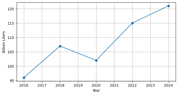 The production of ethanol has increased steadily over the past decade, driven by technological improvements, supportive policies, and rising demand for cleaner transport fuels. In 2024, global ethanol output exceeded 121 billion liters, reflecting renewed momentum in both developed and emerging markets. This growth stems from the adaptability of ethanol feedstocks, from corn and sugarcane to cellulosic biomass, allowing countries to leverage local agricultural strengths.